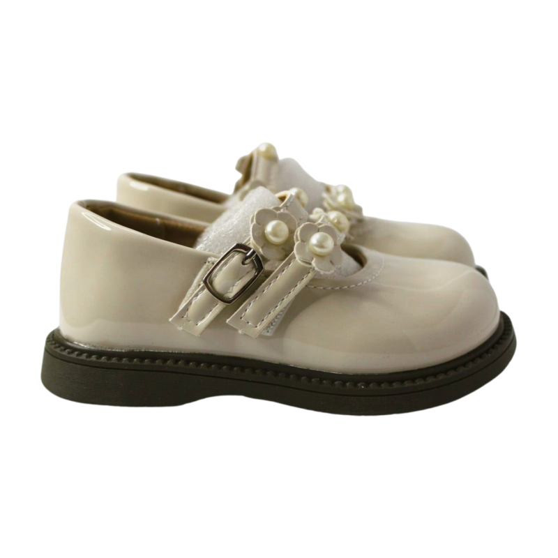Elegant LILREDFOX black patent Mary Jane shoes for kids' party wear. Features double pearl-flower straps, a soft comfortable midsole, and a non-slippery rubber sole for safe, sophisticated style.