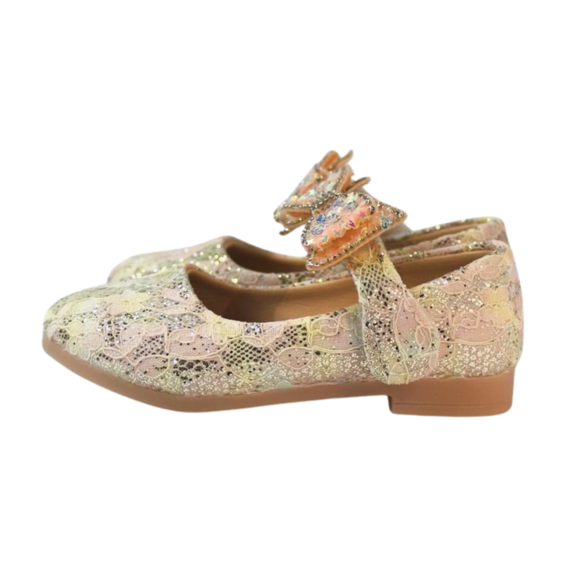 Let your child make a memorable entrance with the LILREDFOX Shimmering Pink Lace & Crystal Bow Mary Jane Flats. These