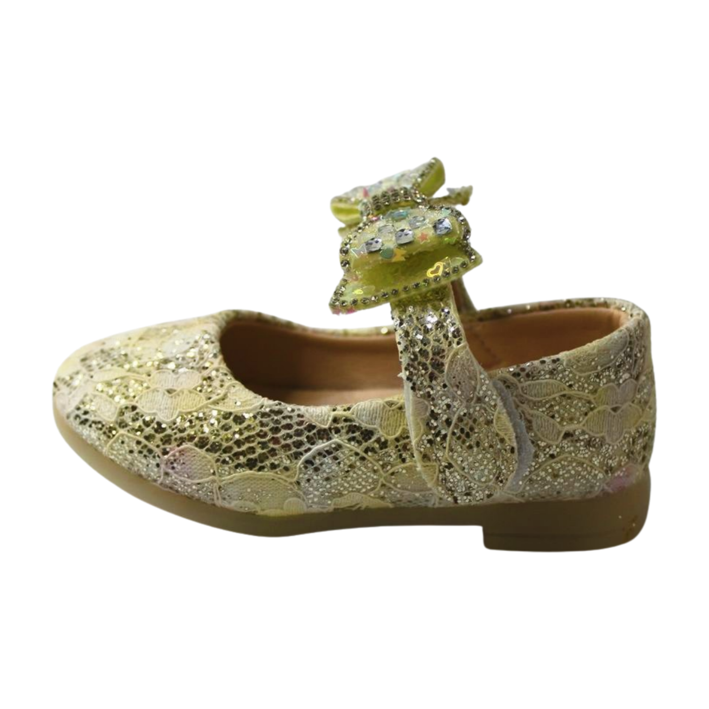 Dazzling LILREDFOX Mary Jane flats for kids’ party wear. Features light gold lace and glitter, a rhinestone-encrusted bow, a soft comfortable midsole, and a non-slippery rubber sole with a bow tread for safe, glamorous style.
