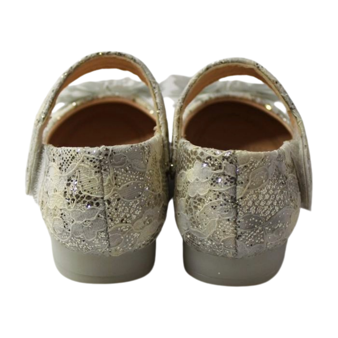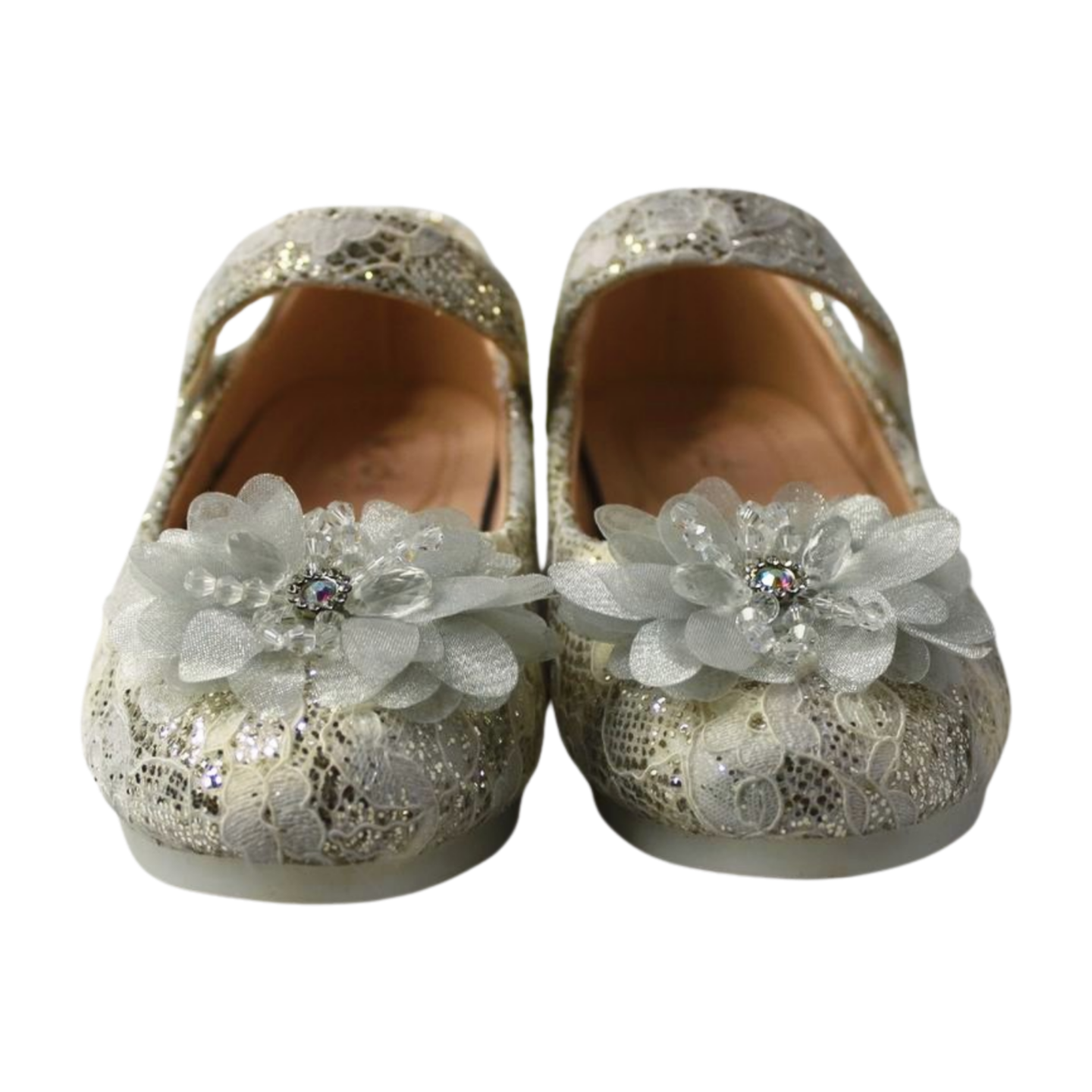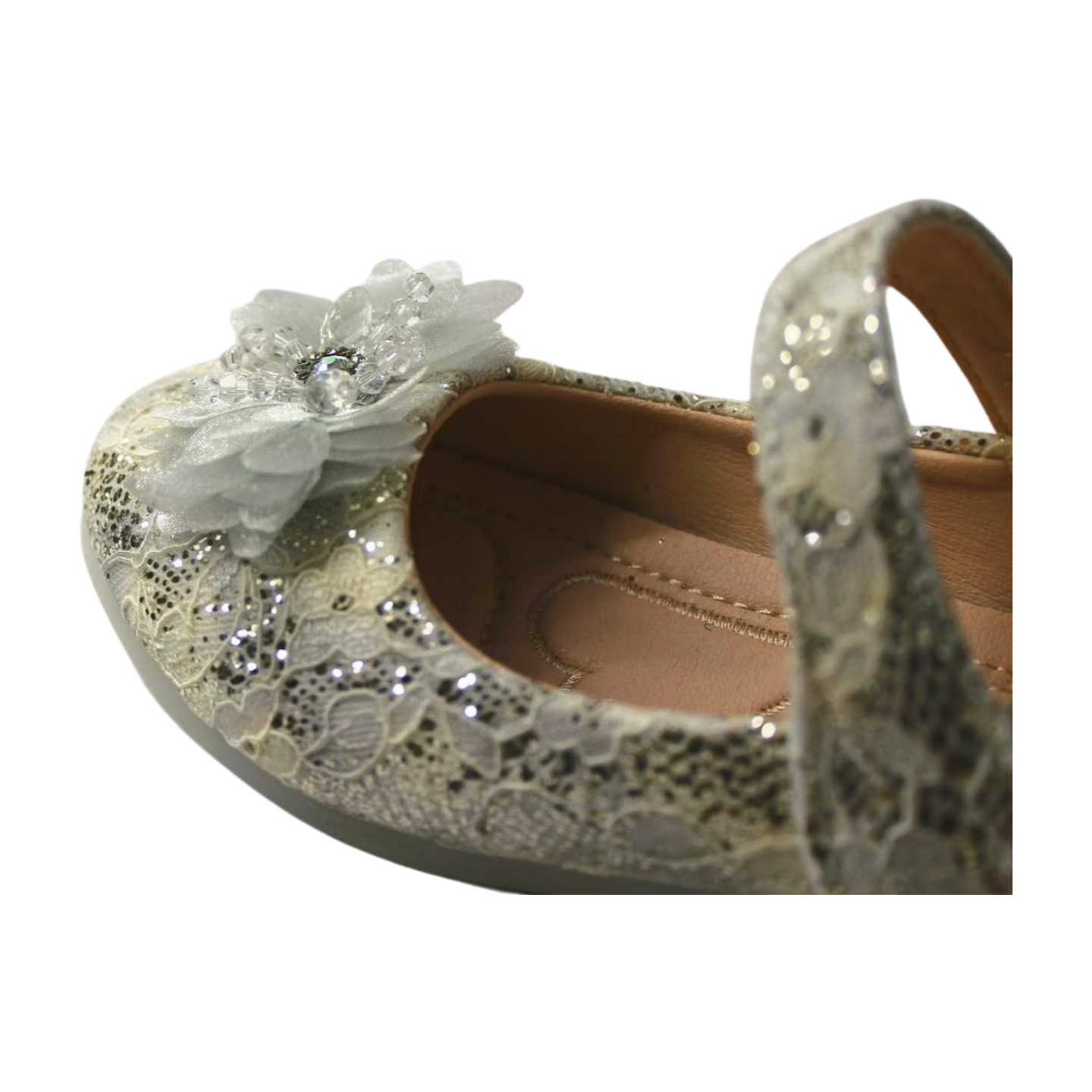 Luxurious LILREDFOX Mary Jane flats for kids’ party wear. Features lace and glitter overlay, a delicate organza flower, a soft comfortable midsole, and a non-slippery rubber sole with a bow tread for safe, elegant style.