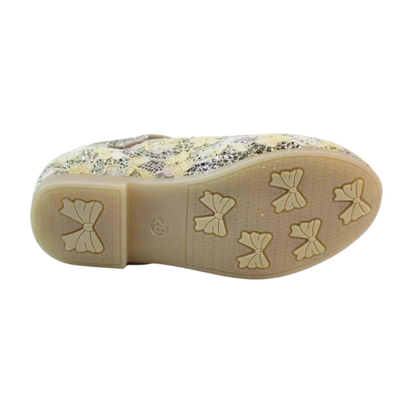 Let your child make a memorable entrance with the LILREDFOX Shimmering Gold Lace & Crystal Bow Mary Jane Flats. These gorgeous "Belly" style shoes are designed as breathtaking party wear, making them the perfect statement piece for birthdays, weddings, festive gatherings, or any celebration. The upper boasts a rich, shimmering light gold glitter base, beautifully accented by an elegant lace overlay that adds texture and depth. The single Mary Jane strap secures the shoe comfortably, while the highlight is the magnificent toe embellishment: a structured, oversized bow that is completely encrusted with multi-faceted, iridescent crystals and rhinestones for unparalleled glamour. At LILREDFOX, we guarantee this dazzling style is paired with essential comfort and safety for active kids. These stunning flats feature a soft, comfortable midsole with a padded insole, providing gentle cushioning and necessary support for long hours of dancing and playing. Furthermore, safety is paramount: the shoe is completed with a durable, low-profile, and non-slippery rubber sole. The unique outsole features a charming bow-patterned tread for reliable traction, giving you peace of mind that your little one will maintain stable footing on smooth event floors. The hook-and-loop strap, cleverly placed under the bow, allows for quick adjustments and a secure fit. Choose the LILREDFOX lace and crystal bow flats for the perfect blend of luxurious style and reliable comfort.
